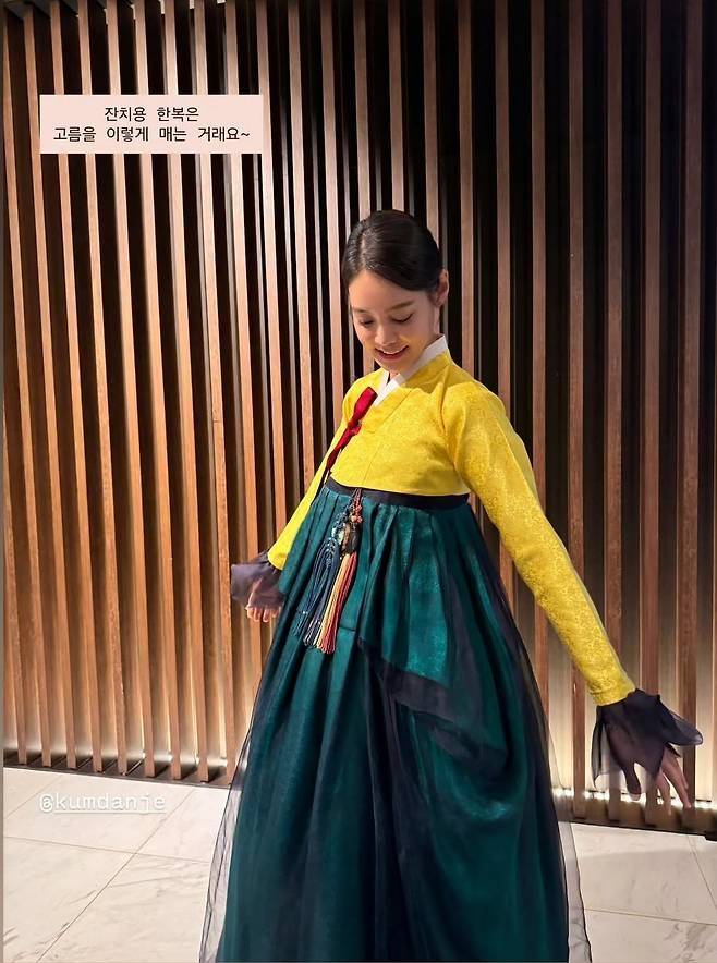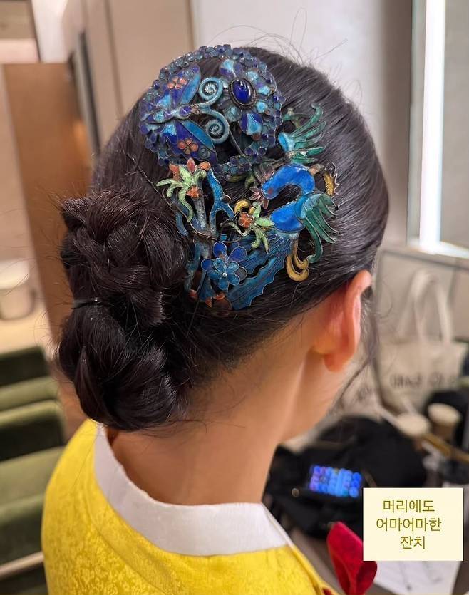 특히 뒤통수 아래에 탄탄하게 감아올린 매듭 실루엣은 단순한 스타일링을 넘어선 우아함을 자아냈다. 헤어라인 주변에 섬세하게 더해진 나비와 꽃 장식은 전통적인 아름다움에 생동감을 불어넣으며, 단아함 속에서도 화사한 포인트를 완성했다.