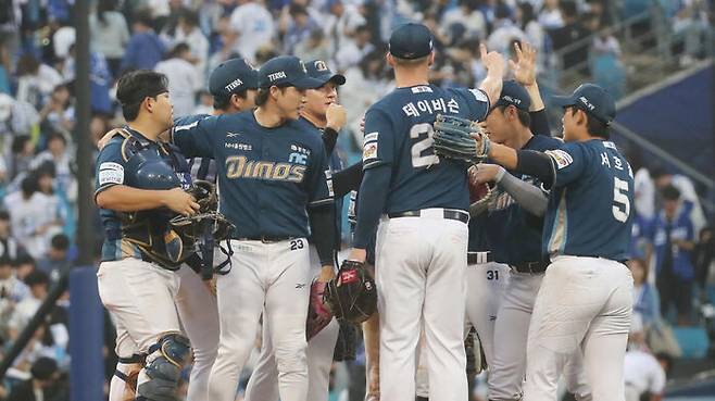 ▲ 6일 대구 삼성라이온즈파크에서 열린 2025 KBO 포스트시즌 와일드카드 1차전 삼성 라이온즈와 NC 다이노스의 경기서 NC가 승리 후 선수들이 기뻐하고 있다.