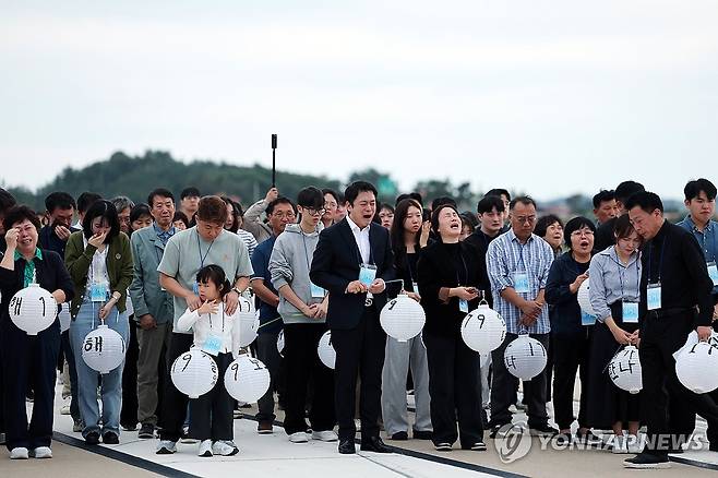 (무안=연합뉴스) 정다움 기자 = 추석인 6일 오후 전남 무안군 무안국제공항 활주로에서 열린 12·29 제주항공 여객기 참사 유가족 협의회의 추모행사에서 유가족들이 유등을 들고 오열하고 있다. 2025.10.6