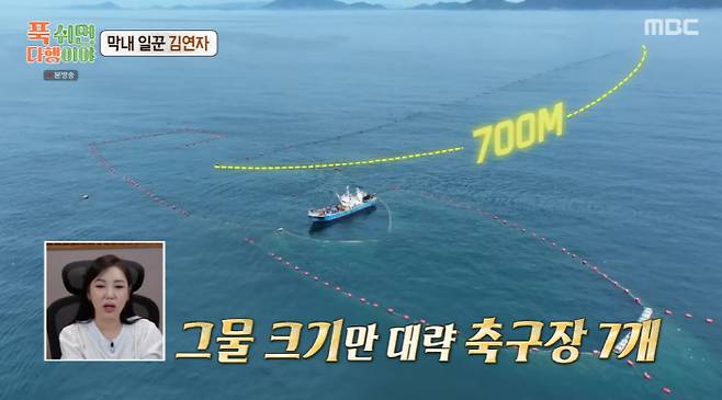 배 말고 그물 값만 억소리 난다는 말, 끝없이 펼쳐진 그물이 바다를 덮고 있었다. 그물 크기만 축구장 7개 규모였다. 선장님은 "제가 진짜 많이 잡았을 때 30톤 이상 잡은 적도 있다"라 전했다.