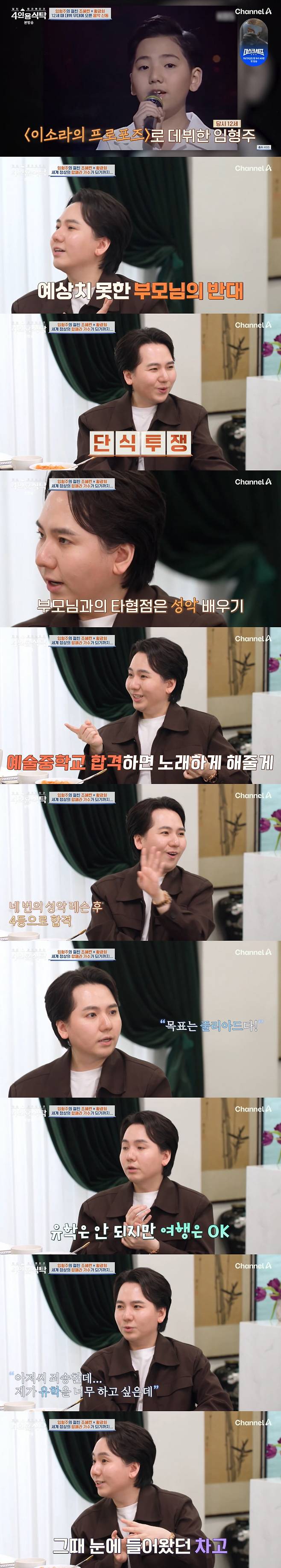 이날 임형주는 "1988년 5월 2일 데뷔했지만, 부모님이 방송 활동을 반대하셨다. 그때 부모님과 타협점이 성악이었다"면서 "입시 두 달 앞두고 예술중학교 합격하면 노래를 하게 해주겠다고 약속하셨다. 성악 레슨 딱 4번 받고 4등으로 합격했다"고 밝혀 놀라움을 안겼다.