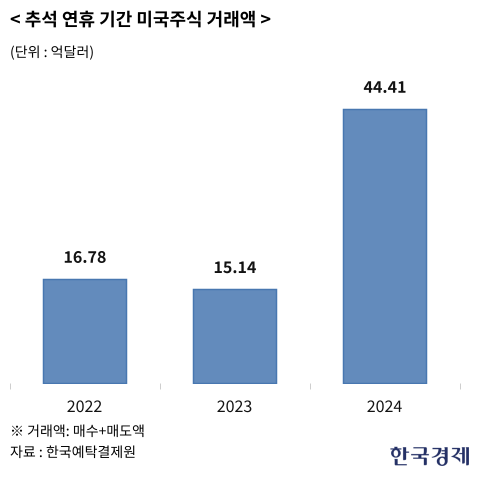6일 한국예탁결제원에 따르면 지난해 추석 연휴 기간(2024년 9월16~18일) 3거래일 사이 미국 주식 거래대금(매수+매도)이 44억4054만달러(약 6조2000억원)에 달했다. 2023년과 2022년 추석 연휴 기간에는 각각 15억1436만달러(약 2조1300억원), 16억7783만달러(약 2조3600억원)로 집계됐다. 지난해 거래 규모는 예년보다 약 3배(178%) 가까이 급증한 것이다. 지난해 미국 주식시장이 사상 최고치를 기록하는 등 활황세를 보이자 추석 연휴에서 적극적으로 매매에 나선 것으로 풀이된다. 올해도 미국 금리인하, 인공지능(AI) 업황 기대 등으로 연휴 기간 미국 주식 투자 수요가 늘어날 것으로 예상된다.