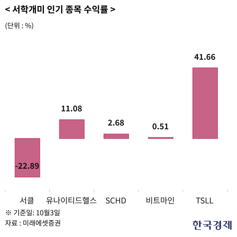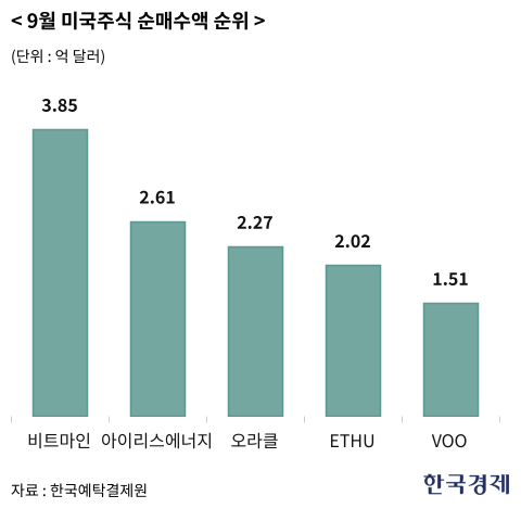 이밖에 지난달 순매수액이 높았던 종목으로는 비트마인(1위), 아이리스 에너지(2위), 오라클(3위), '2X 이더리움’(ETHU) 등으로 나타났다. 아이리스 에너지는 수력, 태양광, 풍력 등 재생에너지를 비트코인 채굴 사업에 활용하고 있다. AI 클라우드로 사업을 다각화하고 있다. 오라클은 최근 오픈AI와 약 3000억달러(약 410조원) 규모의 클라우드 컴퓨팅 계약 등이 호재로 작용하면서 주가가 뛰고 있다.