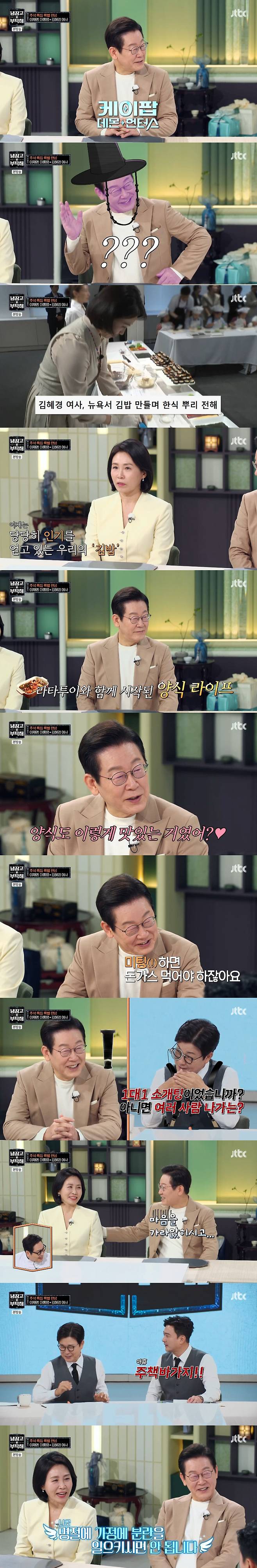 김혜경 여사는 별명이 'K-푸드 전도사'라고. 그는 "뉴욕가서도 어린이들과 김밥 만드는 프로그램도 했었다"고 하자, 이 대통령은 "그때 냉동 김밥을 처음 봤다"고 했다.
