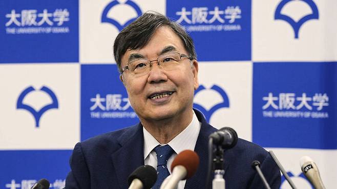 ▲ 사카구치 교수가 6일 노벨상 수상자 선정 발표 후 기자회견하는 모습