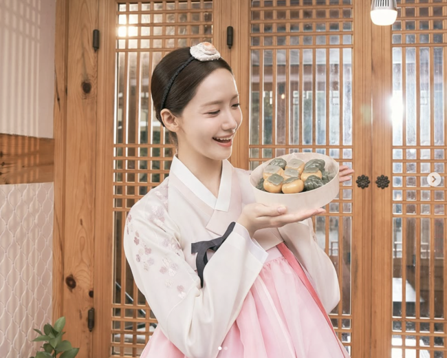 공개된 사진 속에는 윤아가 분홍빛 한복을 차려입고 화과자를 들고 있는 모습이다.
