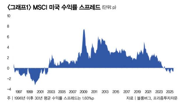 주가수익비율은 주식 가격을 주당순이익(EPS)으로 나눈 값으로, 주가수익비율의 역수는 주식투자로 기대되는 수익을 뜻한다. 예를 들어 주당순이익 1000원이 기대되는 회사 주식을 1만 원에 샀다면 기대수익률은 10%라고 볼 수 있다. 9월 22일 기준으로 보면 미국 주식 PER은 23배이기에 기대수익률은 4.34%가 된다. 같은 날 10년 만기 국채금리는 4.14%로, 수익률 스프레드는 0.20%p로 측정된다. 1996년 이후 30년 평균 수익률 스프레드가 1.60%p인 점을 감안하면 지금 미국 주식은 채권에 비해 큰 매력이 없는 수준임을 알 수 있다(그래프1 참조).