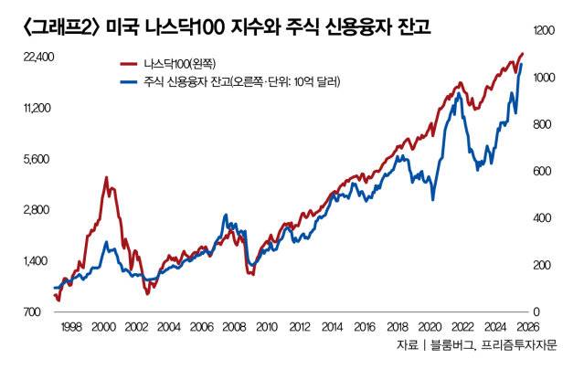 따라서 이보다 더 중요한 위험 요인은 레버리지 투자 증가다. 레버리지 투자는 돈을 빌려 주식을 매수하는 것을 뜻한다. '그래프2'는 주식 신용융자 잔고(Margin Debt)와 미국 나스닥100 지수의 관계를 보여주는데, 강력한 레버리지 투자 붐을 확인할 수 있다. 통상 보유 주식가치의 2.5배를 대출로 빌리기에 1만 달러(약 1400만 원)인 아마존 주식을 가진 투자자는 총액 3만5000달러(약 4900만 원)까지 투자할 길이 열린다.