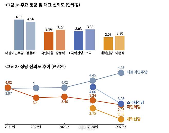 개혁신당도 상황은 다르지 않다. 정당 신뢰도가 2.08점으로 지난해보다 하락했다. 이준석 대표로서도 위기 국면이다. 전체 응답자 41.0%가 이준석 대표에게 ‘0점’을 주었다. 전혀 신뢰하지 않는다는 의미다. 아무리 신뢰도가 낮아도 소속 정당의 지지자들은 당대표에게 6점이 넘는 탄탄한 신뢰를 보내주는데, 이 대표가 개혁신당 지지자들로부터 얻은 신뢰도는 5.97점이었다. 특검 수사가 영향을 미친 것으로 보인다. 지난 7월 명태균씨 공천 개입 의혹을 수사하는 김건희 특검이 공천 개입 의혹 사건 당시 국민의힘 대표였던 그를 피의자 신분으로 강제수사에 나선 바 있다.