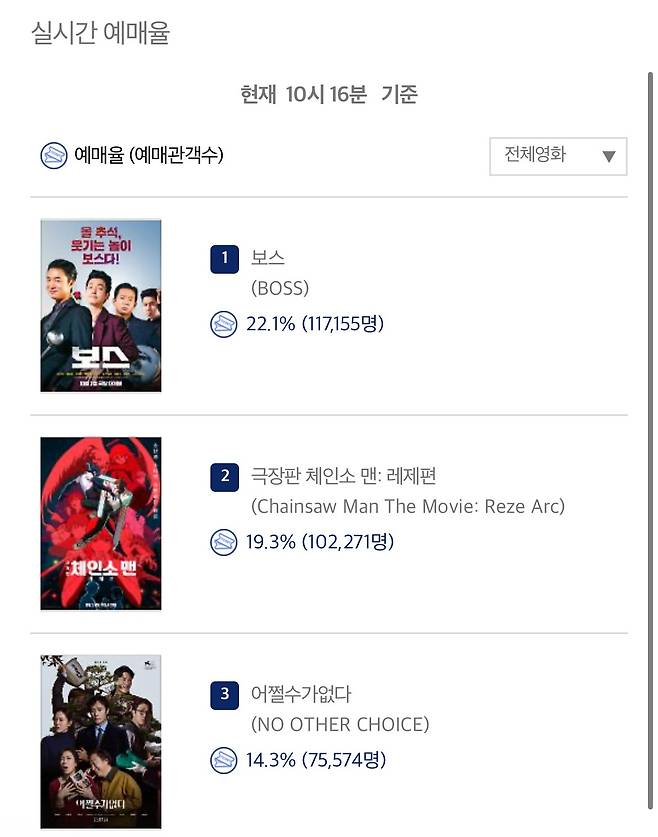 금일 오전 10시 16분 기준, 실시간 예매율도 1위다. 예매율 22.1%로 11만 7,155명이 예약했다. '극장판 체인소 맨: 레제편'이 그 뒤를 이었다. 박찬욱 감독의 '어쩔수가없다'가 3위에 자리했다.