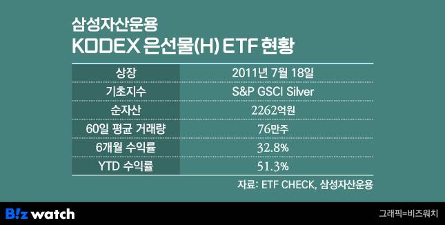 금값 고공행진에 가려져 있지만, 은의 수익률도 상당하다. KODEX 은선물(H)의 지난 1일 종가기준 6개월 수익률은 32.8%, 1월 1일 이후 올해 수익률(YTD)은 51.3%에 이른다.