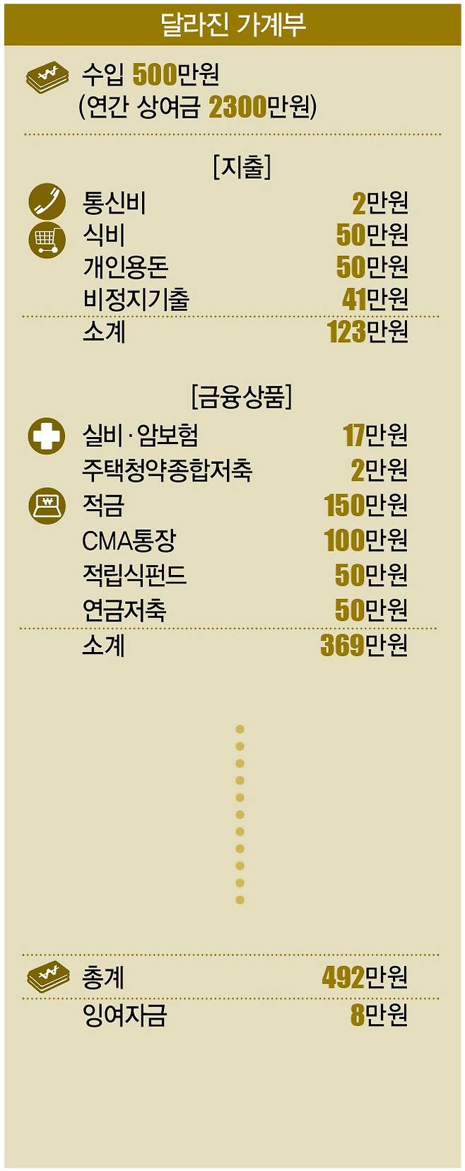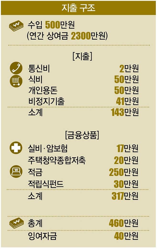 가입한 금융상품으로는 실비보험과 암보험료 17만원, 주택청약종합저축 20만원, 적금 250만원, 적립식펀드 30만원 등 317만원이었다. 총지출은 460만원으로, 잉여자금 40만원과 상여금 2300만원은 통장에 모아 두고 있었다. 현금자산은 전세 보증금 1억원 외에 3000만원가량이 더 있었다.