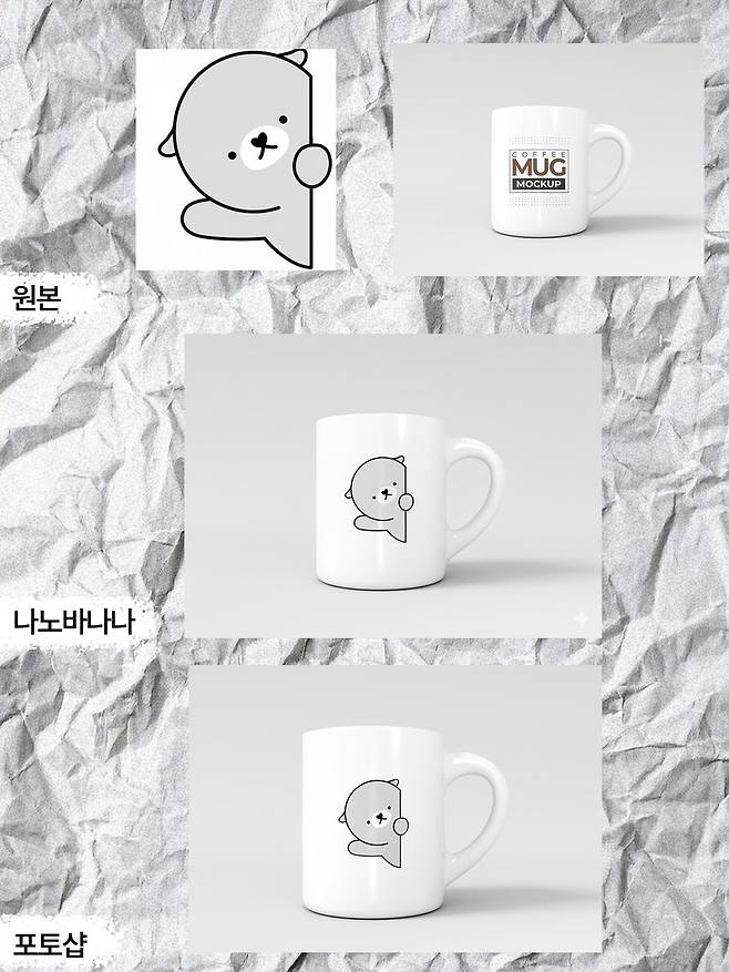 머그컵에 로고를 얹는 작업도 진행해 봤다. 나노바나나에서는 두장의 이미지를 올려 조합하라고 지시했다. 10초가 채 안 걸려 자연스럽게 합성된 이미지가 나왔다. 특히 머그컵의 빛 반사 부분이 로고 위에도 자연스럽게 표현돼 있음을 확인할 수 있다. 포토샵 생성형 기능만으로는 합성이 어려웠으나, 포토샵에서 제공하는 일반 도구를 활용해 유사하게 만들 수는 있었다.