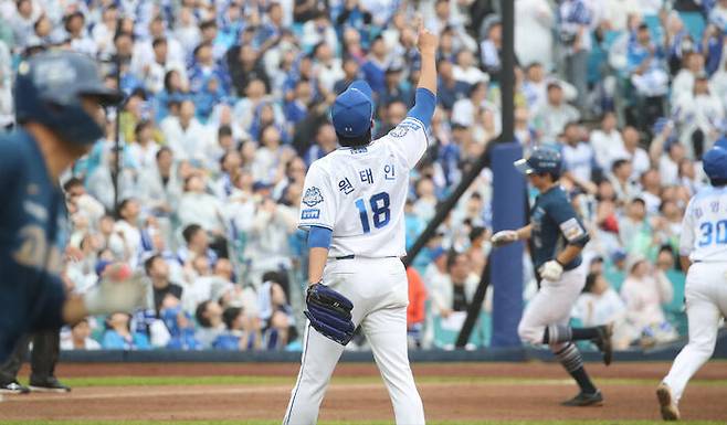 원태인은 풀 카운트(3볼-2스트라이크)에서 박건우를 시속 147㎞ 직구로 루킹 삼진 처리했습니다.