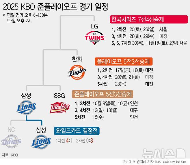 [서울=뉴시스] 7일 삼성 라이온즈가 NC 다이노스와의 경기에서 3-0으로 승리하며 준플레이오프에 진출했다. 정규시즌 3위로 준플레이오프에 직행한 SSG와 삼성은 9일 준플레이오프 1차전을 치른다. (그래픽=안지혜 기자)