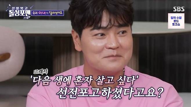 추신수는 다음 생에 혼자 살고 싶다고 선전포고했다고 밝혔다. 추신수는 "21살에 결혼하고 타국에서 아이를 키우다 보니, 책임감이 그땐 너무 힘들었다. 가끔 일주일 동안 혼자 있을 때가 있는데, 그 어느 곳에 여행 가는 것보다 제일 행복했다"라며 웃었다.