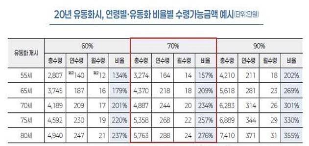'가입 18년 이후'라는 조건을 만족하면 상품 가입자는 원하는 시점에 사망보험금을 연금으로 바꿀 수 있습니다. 예를 들어 35세 남성이 가입금액 3000만원 기준으로 보험료 납입을 완료했다고 가정하고 20년 후 55세 시점에 연금으로 전환하면, 국민연금 수급 전인 초기 10년 동안은 매년 약 367만원, 이후에는 약 183만원의 연금을 받을 수 있습니다.