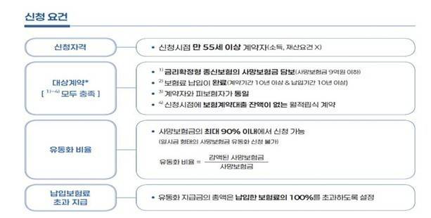 유동화는 사망보험금의 최대 90% 이내에서 신청이 가능합니다. 신청 시점에 만 55세 이상인 계약자가 대상이며, 소득과 재산 요건은 따지지 않습니다. 사망보험금이 9억원 이하인 계약만 해당되며, 또 금리연동형이 아닌 금리확정형 종신보험만 가능합니다. 여기에 10년 이상 보험료를 납부해, 납입을 완전히 끝낸 계약이어야 합니다. 이밖에 계약자와 피보험자가 동일해야 한다는 조건도 있습니다.