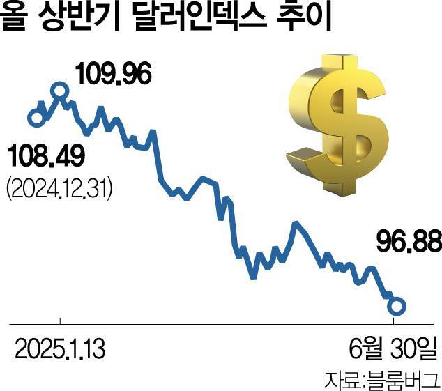 올 상반기 달러인덱스의 하락률(10.8%)은 브레턴우즈 체제의 금본위제가 무너지고 변동환율제가 도입됐던 1973년 상반기(14.8%) 이후 최고 수준이었다. 브레턴우즈 체제는 2차 세계대전 이후 국제 경제 질서를 재편하기 위해 1944년 수립한 국제 통화 시스템이다. 35달러의 가치를 금 1온스로 고정해 놓고 다른 나라 화폐는 기축통화인 미국 달러화와 교환하게 한 체제다. 브레턴우즈 체제는 베트남 전쟁에 따른 재정 지출과 미국의 국제 수지 적자 문제로 1971년 리처드 닉슨 전 대통령 시기에 막을 내렸다.