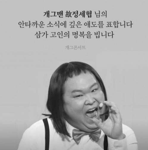 이러한 가운데 KBS 2TV '개그콘서트' 제작진이 전한 부고 공지를 공개, '개그콘서트' 측은 "개그맨 고(故) 정세협 님의 안타까운 소식에 깊은 애도를 표합니다. 삼가 고인의 명복을 빕니다"라며 흑백으로 된 생전의 모습을 공개했다.