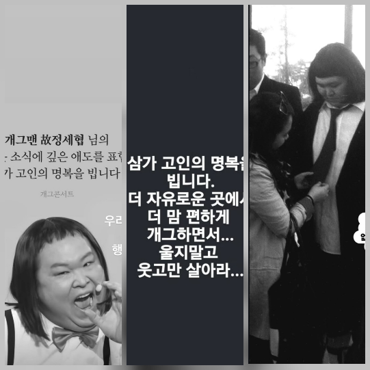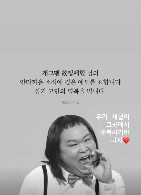 개그맨 박성광도 “우리 세협이, 그곳에서는 행복하기만 하자”라는 글과 함께 정세협의 무대 사진을 게재하며 고인을 추모했다.