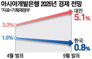 반면 ADB가 추산한 한국의 올해 성장률 전망치는 0.8%에 그쳤습니다. 성장 속도에서만 6배 가까운 격차가 벌어진 셈입니다. 내년에도 대만(2.3%)이 한국(1.6%)보다 높은 성장세를 이어갈 것으로 전망됐습니다.