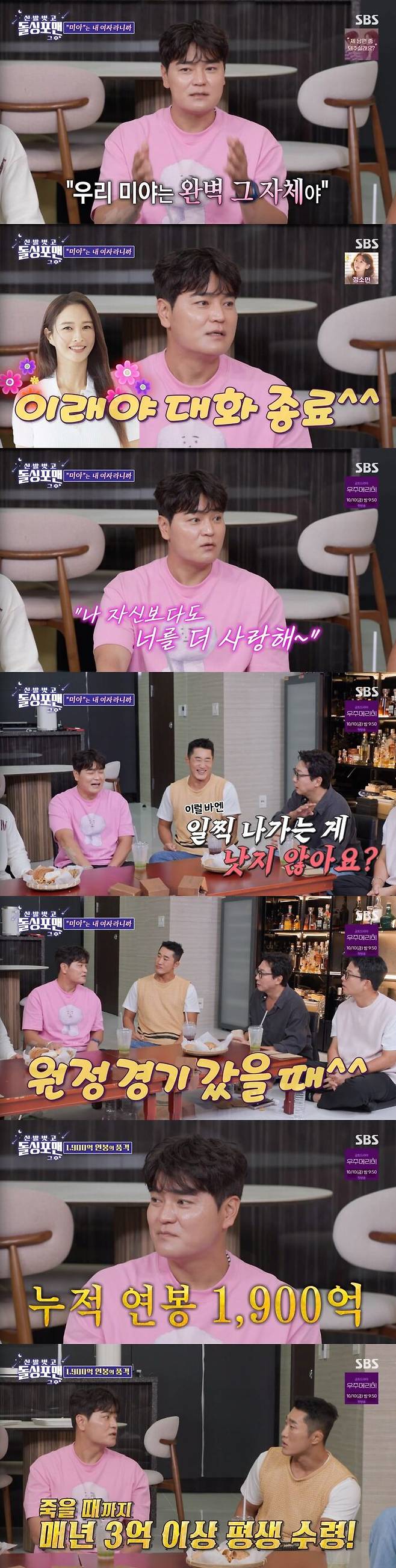 누적 연봉 1900억의 추신수는 MLB에서 연금이 나온다며 "지금 받으면 금액이 적고 60세 이후에는 금액이 많아진다. 대략 한 달에 2억 8천에서 3억 정도 죽을 때까지 나온다"라고 말해 모두를 놀라게 했다.