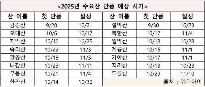 2025년 첫 단풍은 설악산에서 9월 30일쯤 시작되겠고요.
