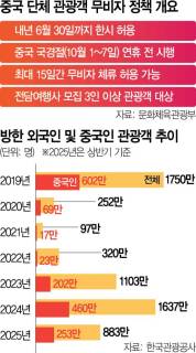 정부는 지난 9월 29일부터 내년 6월 30일까지 3인 이상 중국인 단체관광객에 한해 비자 없이 최대 15일간 한국에 머무를 수 있도록 했다. 팬데믹 이후 위축됐던 한·중 관광 교류를 회복하고 내수를 살리겠다는 의도다. 제주도는 기존처럼 개별·단체 모두 30일 무비자 체류가 가능하다.