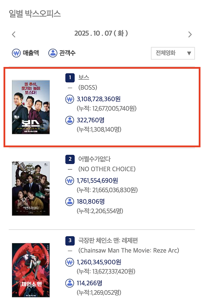 '어쩔수가없다'는 7일 18만 812명(누적 220만 6,560명)을 모았다. 3위는 '극장판 체인소맨: 레제편'(11만 4,264명, 누적 126만 9,050명)이다.