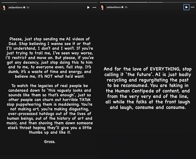 로빈 윌리엄스의 장녀인 젤다 윌리엄스는 6일(현지시각) 자신의 인스타그램 게시글을 통해 "제발, 아버지의 AI 영상을 내게 그만 보내달라"고 했다.