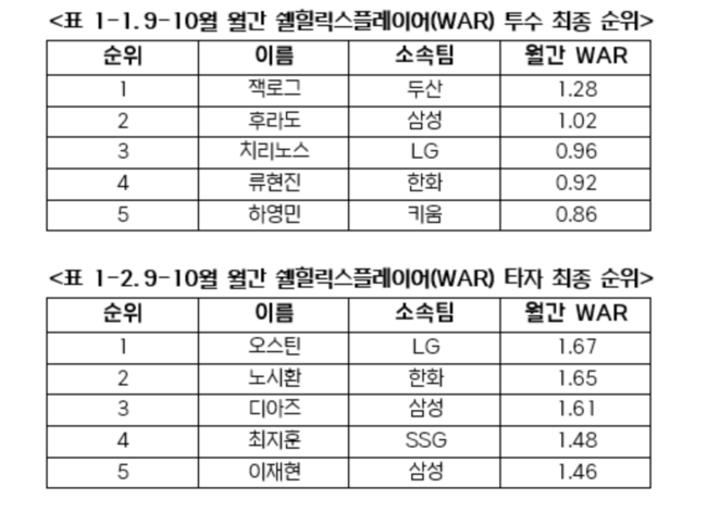 ‘쉘힐릭스플레이어’는 WAR(대체 선수 대비 승리 기여도)를 기준으로 선정하며, 9-10월 투수 부문에서는 두산 잭로그가 WAR 1.28로 1위를 차지했다.
