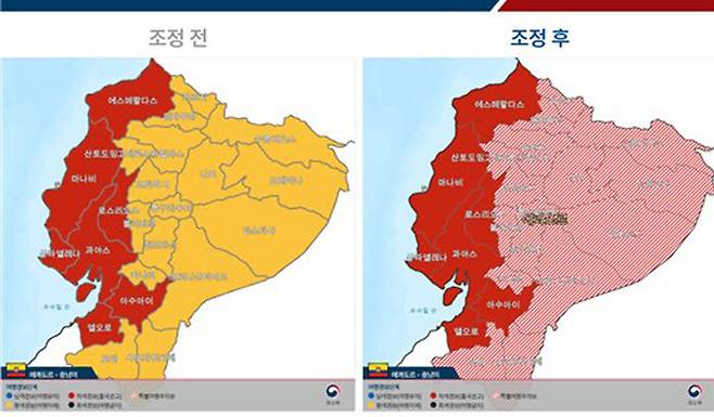 '여행 자제'에 해당하는 기존 여행경보 2단계 지역인 갈라파고스 제도와 3단계 '출국권고' 지역인 과야스 주·아수아이 주·로스리오스 주·산타엘레나 주·엘오로 주·마나비 주·에스메랄다스 주에 대한 경보는 유지하고, 나머지 모든 지역에 특별여행주의보가 발령됐습니다.