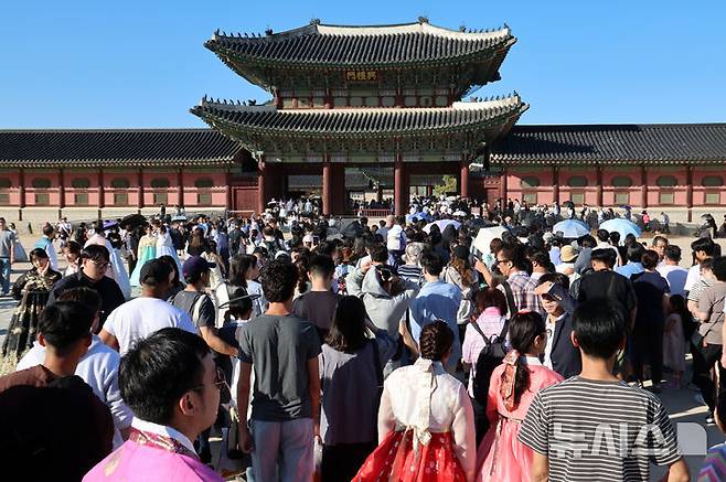 [서울=뉴시스] 조성우 기자 = 추석 연휴 엿새째인 8일 오후 서울 종로구 경복궁이 시민들과 내외국인 관광객들로 북적이고 있다. 2025.10.08. xconfind@newsis.com