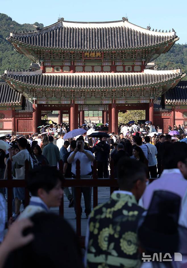[서울=뉴시스] 조성우 기자 = 추석 연휴 엿새째인 8일 오후 서울 종로구 경복궁이 시민들과 내외국인 관광객들로 북적이고 있다. 2025.10.08. xconfind@newsis.com