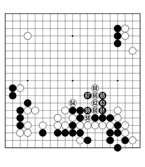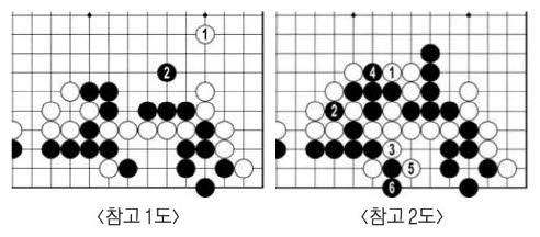 <참고 1도> 백1로 벌려 집을 늘리면 흑2로 지킨다. 이때 형세는 5대5에 가깝다. 수가 나는 곳에서는 곧장 수를 내야 한다는 변상일은 백58로 움직이고 60에 끊었다. 백이 크게 앞설 수도 있고 거꾸로 당할 수도 있는 싸움이다. 백66으로 <참고 2도> 1에 두면 못 쓴다. 백3은 통하지 않는 팻감. 흑6으로 늘면 백이 지는 싸움이다.