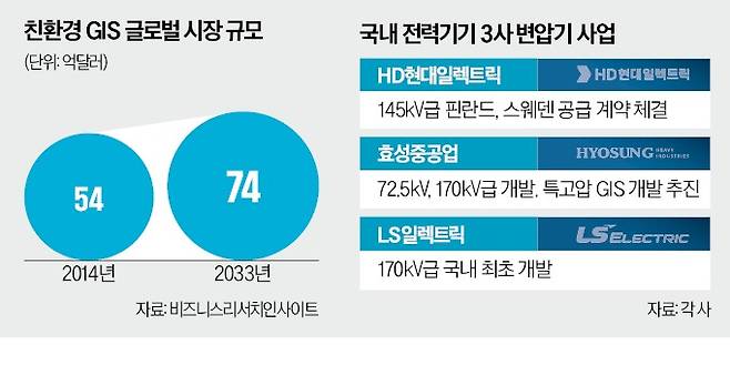 HD현대일렉트릭, 효성중공업, LS일렉트릭 등 국내 전력기기 회사들이 2033년 10조원 규모로 커질 친환경 가스절연개폐장치(GIS) 시장에 일제히 도전장을 내밀었다.