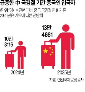 인천국제공항공사에 따르면 국경절 기간 중국에서 인천국제공항을 통해 입국한 여객은 코로나19 이후 최대치를 기록했다. 올해 예약에 따른 전망치는 13만4661명으로, 지난해 대비 30.5% 증가했다. 하루평균 여객도 2023년 1만3546명에서 올해 1만6833명으로 24.2% 늘었다. 한국관광공사에 따르면 올해 1월부터 8월까지 방한한 중국인 관광객은 373만3606명으로 전체 방한객의 30.2%를 차지했다. 지난해 같은 기간보다 17.2% 늘어난 수치다.