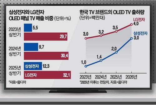 8일 글로벌 리서치 업체 옴디아에 따르면 삼성전자가 2025년 상반기 출하한 TV 중 OLED 패널을 사용한 TV 비중은 12.3%를 기록했다. 특히 1500달러 이상 프리미엄 TV 매출 중 39.4%가 OLED TV에서 나온 것으로 집계됐다. 그간 라이벌인 LG전자를 의식해 OLED TV 판매에 소극적이었던 삼성전자가 OLED 판매에 적극적으로 돌아선 것은 큰 변화다.