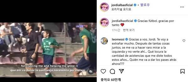 미국 매체 '스포츠일러스트레이티드'는 8일(이하 한국시간) "메시가 오랜 동료 조르디 알바의 깜짝 은퇴 소식에 진심 어린 메시지를 전했다. 그는 '앞으로 왼쪽을 봐도 네가 없다는 게 이상할 것 같다'며 함께한 세월에 대한 그리움을 드러냈다"고 전했다.