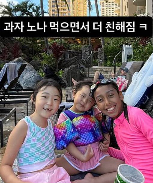 영상에는 이지혜의 딸 태리 양이 하와이에서 처음보는 외국인 친구들과 대화를 나누며 자연스럽게 친해진 모습.