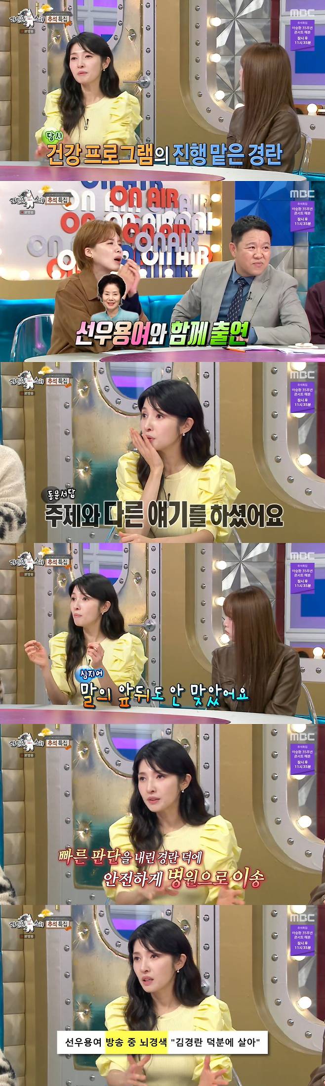 자신이 잘못 들은 거라 착각한 김경란은 진행을 이어갔지만 이후에도 선우용여의 행동은 이상했다고.