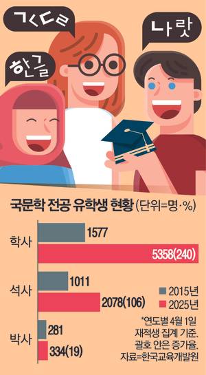 국내 대학에서 학위과정을 밟는 외국인 유학생이 해마다 늘어나고 있는데, 그중에서도 국어·국문학 전공의 신규 유입이 두드러진다. 한국교육개발원에 따르면 지난 4월 기준 국내 대학에서 학사·석사·박사 등 정규 학위과정을 이수하고 있는 외국인 유학생은 7770명으로 집계됐다. 2015년 2869명과 비교하면 2.7배 규모로 늘어난 것이다.
