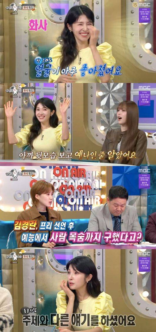 특히 이날 김경란은 촬영 중 선우용여를 구한 일화를 전해 눈길을 끌었다. “프리 선언 이후에 예능에서 사람 목숨까지 구했다고?”라는 물음에 김경란은 “당시 건강 프로그램이었는데 의사 선생님도 많이 계셨다. 방청객도 계시고, 큰 프로그램이었는데 선우용여 선생님이 계셨다”라고 말문을 열었다.