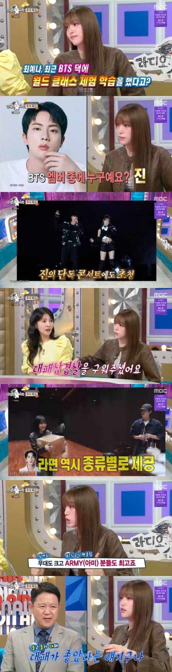 '라디오스타'에서 최예나가 BTS 진과 함께 작업하면서 '월드 클래스는 다르다'는 것을 느꼈다고 전했다.