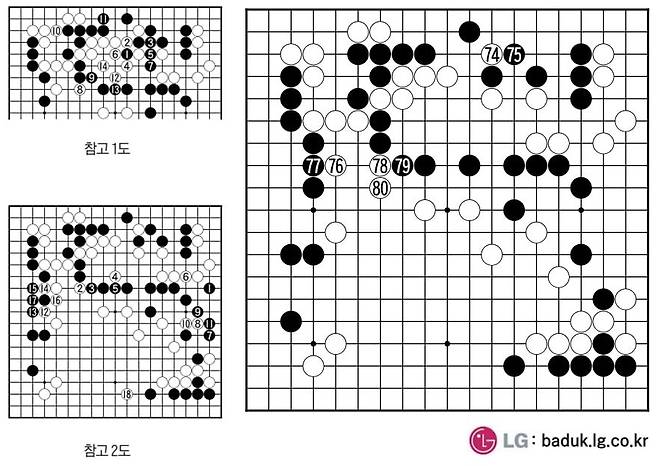 76으로 들여다보았을 때 당장 받지 않더라도 큰 수는 없으므로 흑으로서는 고민되는 장면이다. 참고 1도 1, 3으로 끊어 가면 어떻게 될까? 백이 8, 10으로 활용하고 나서 14로 살게 되므로 흑이 실패. 그렇다면 참고 2도 1, 7로 사는 것은? 반상 최대인 18의 곳을 백이 차지하게 돼 역시 흑이 실패한 그림으로 보인다.