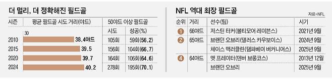 최근에는 50야드 이상 장거리 필드골 시도가 늘어나면서 필드골을 전담하는 키커의 존재감이 더욱 두드러진다. 과거에는 시도조차 어려웠던 먼 거리에서 과감하게 필드골을 차서 3점을 얻는 장면이 많아졌기 때문이다. 덕분에 경기가 자주 뒤집히고 손에 땀을 쥐는 명승부가 펼쳐진다. 2000년만 해도 NFL 평균 필드골 시도 거리는 36.6야드였지만, 2010년 38.4야드로 늘어났고, 지난 시즌(40.2야드)엔 처음으로 40야드를 넘었다. 2010시즌엔 50야드 이상 필드골을 105회 시도해 59회 성공(성공률 56.2%)했는데, 2024시즌엔 278회 시도, 195회 성공(성공률 70.1%)했다. 시도 횟수가 2.6배 늘었을 뿐만 아니라 정확도도 크게 올라간 것이다.
