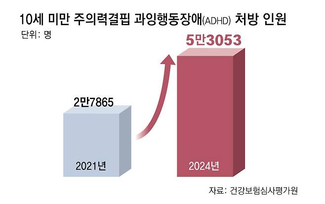 건강보험심사평가원에 따르면 10세 이하 ADHD 급여 의약품 처방 인원은 2021년 2만7865명에서 지난해 5만3053명으로 3년 새 1.9배로 늘었다.