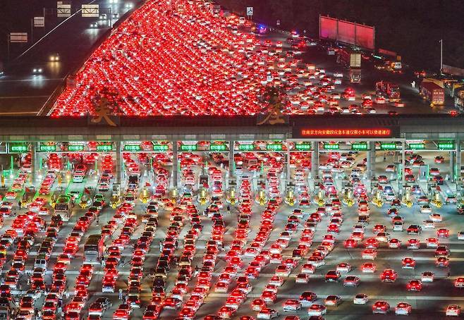 중국 국경절 연휴(10월 1∼8일)가 끝나 가는 7일 안후이성 추저우에서 고속도로 통행료 징수소에 몰려든 차량 행렬로 극심한 정체가 빚어지고 있다. 중국 당국은 이번 연휴 기간 중 귀성객과 관광객의 누적 이동 인원이 23억6000만 명에 달할 것으로 내다봤다.