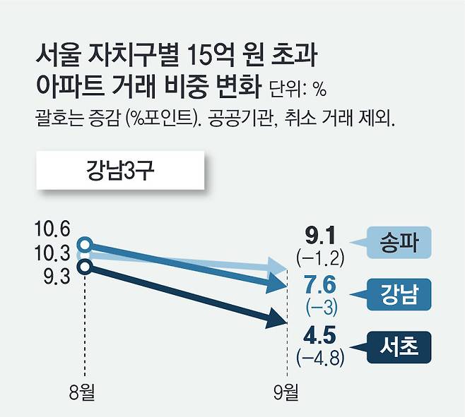 이런 현상은 규제 지역이 아닌 비강남 한강벨트 지역에서 집중적으로 나타났다. 9월 15억 원 초과 아파트 거래 비중은 성동구가 16.9%로 전달(13.8%)보다 3.1%포인트 올랐다. 마포구는 9.4%로 전달보다 1.3%포인트 올랐다. 반면 강남·서초·송파 등 강남 3구는 전달보다 모두 감소했다.